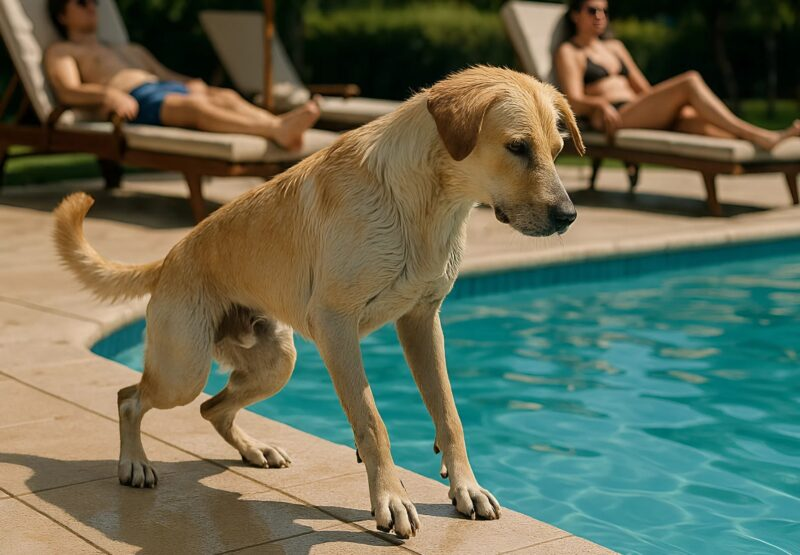 Suddenly, the guests’ attention was caught by a dog standing right at the edge of the pool. It was a large, light-colored dog, wet and visibly upset. He stared into the water, then started barking loudly, pacing back and forth as if calling for help.