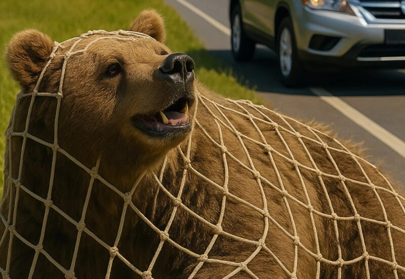 My foot pressed the gas instinctively, but on a second glance I realized: the bear wasnât just sitting there â it was caught in a large net. The ropes pulled tightly around its shoulders and paws, its fur was matted, and the animal was breathing heavily, growling as if asking for help.