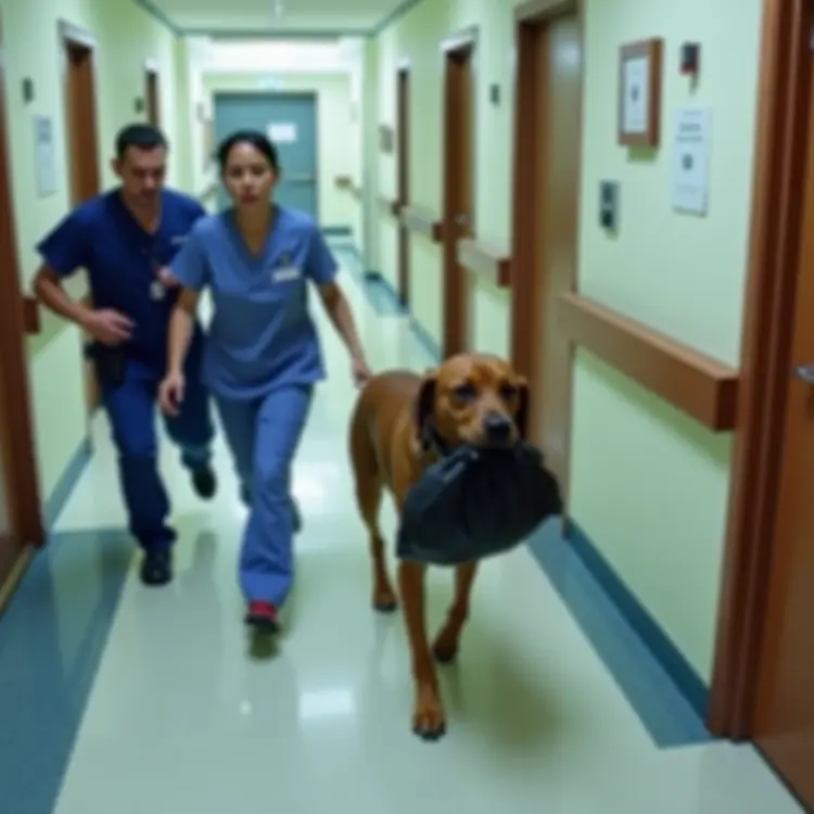 Inside the hospital, the staff and patients were momentarily distracted from their routines by the unexpected visitor. Nurse Ellie, a gentle soul with a soft spot for animals, was the first to approach Max. Kneeling down, she spoke to him in a soothing voice, attempting to coax the bag from his grip. Max, understanding the gesture, gently released the bag at her feet, looking up at her with eyes that seemed to plead for understanding.