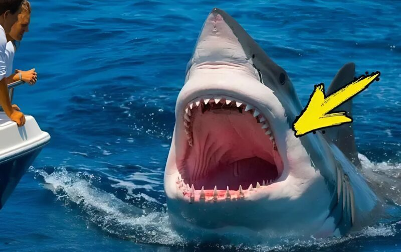 A massive shark emerged from the water, its jaws open so wide it looked as though an entire boat could fit inside.