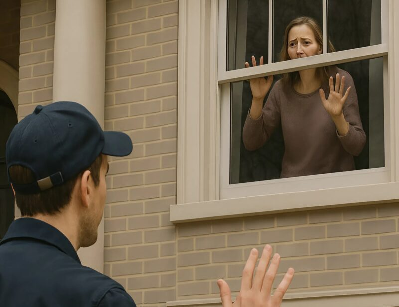 At the window stood a woman of about forty. She was staring straight at him. The courier instinctively raised his hand, thinking she was simply greeting him. But her gestures were not a greeting. She was pounding her palms against the glass, waving her arms desperately, and shouting something while pressing her face to the window.