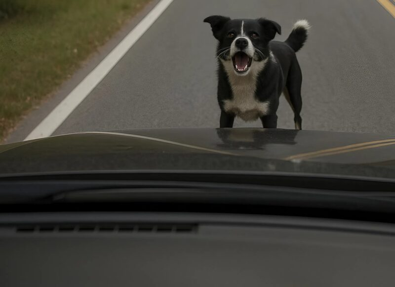 A dog jumped onto the road and was almost hit by my car: I slammed on the brakes, and the dog looked at me, barking loudly, but then I noticed something in the grass…