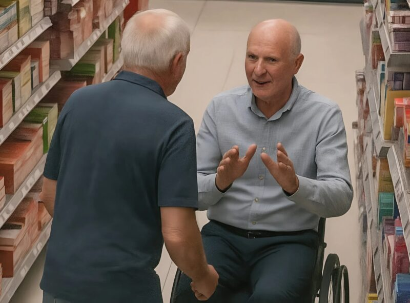 I was rolling between the aisles, carefully looking at the products. The basket on my lap was already half full. Turning into another aisle, I accidentally bumped the wheel of my wheelchair against a man’s foot who was standing with his back to me.