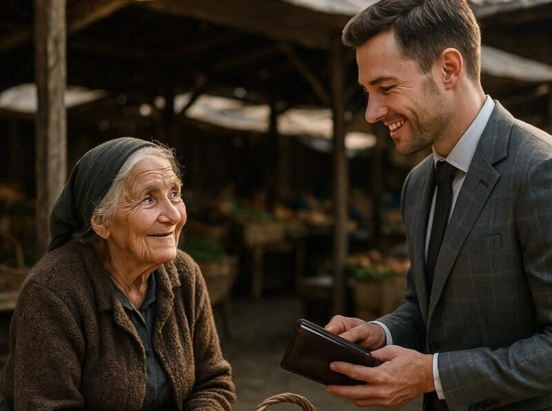 He took out his wallet, counted several large bills, and placed them directly into the trembling hand of the grandmother.