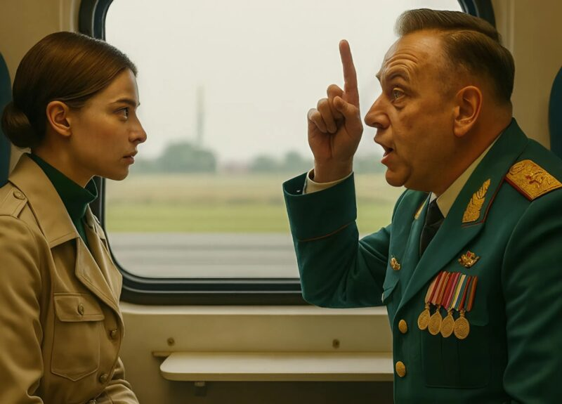 She sat down across from a man in a military uniform, covered in medals. He was a lieutenant colonel — stern, confident, with the posture of a man used to authority.