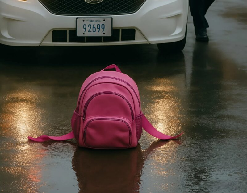 At an intersection, he noticed something strange — a little girl was standing completely alone in the middle of the road, motionless in the pouring rain, like a forgotten toy. Her thin shoulders were covered by a gray raincoat, and a small pink backpack hung from her back.