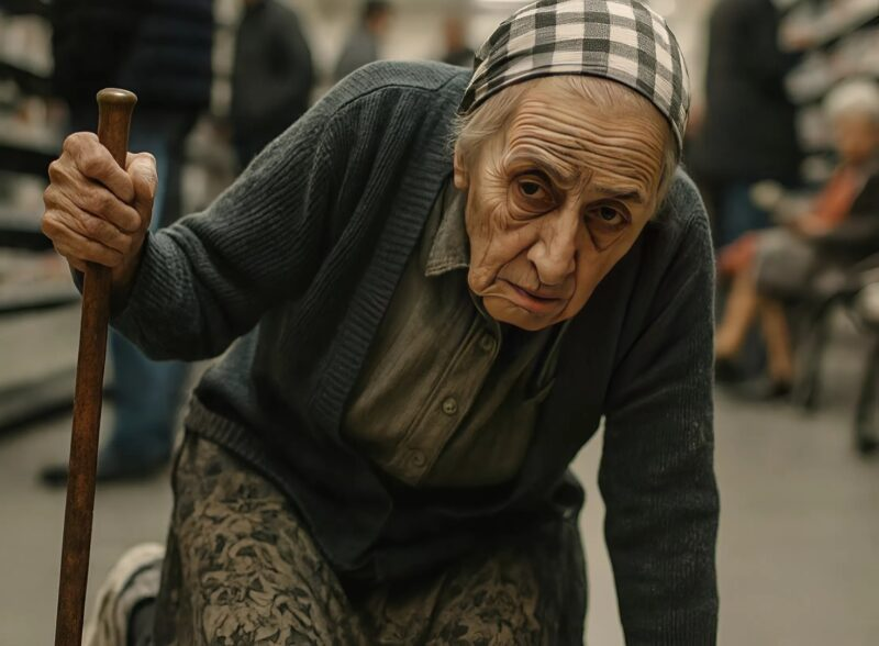 Gasping for breath, the grandmother crawled toward the exit. One hand clutched her cane, the other pressed against the cold tiled floor. The noise of the store seemed to fade away — all that could be heard was her heavy breathing and faint moans of pain. Every movement was agony, but she kept going, hoping to make it outside and somehow get home.