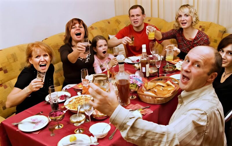 Dirty footprints all over the floor, crumpled napkins in the living room, empty bottles, overturned glasses. In the kitchen — a mountain of unwashed dishes, dried food scraps on the table, a sticky floor, and the smell of alcohol everywhere.