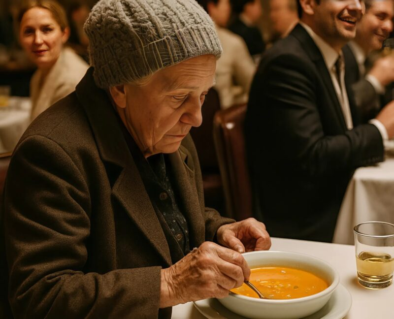 Reluctantly, they seated her at the farthest table, almost by the wall. The guests sitting at tables with white tablecloths exchanged curious glances — who was this old lady who dared to come here, where only rich people dined? It seemed as though the very atmosphere of luxury and brightness rejected her presence.