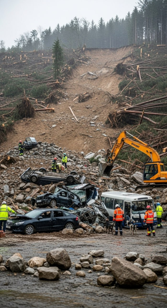 The video opens with an apocalyptic scene: a vast hillside has been flattened, trees uprooted, and a massive amount of mud and rocks has cascaded down, burying a section of road. The image of chaos is clear, with crushed and completely deformed cars, and a small bus trapped in the debris.