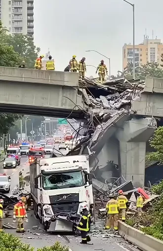 A sh0cking collision unfolded as a semi-truck slammed into a city overpass pillar