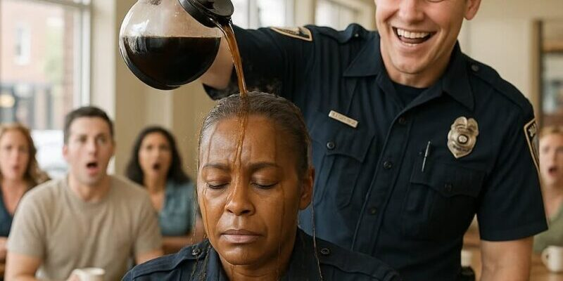 As she reached for her cup, a police officer behind her bumped hard into her shoulder, spilling the hot liquid across the counter and onto her sleeve.