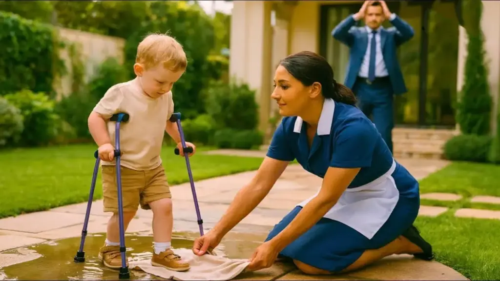It was the scene beside her. Her son, Mateo, just four years old, was standing with his small purple crutches, holding a dishcloth and trying to help the young woman clean the floor.