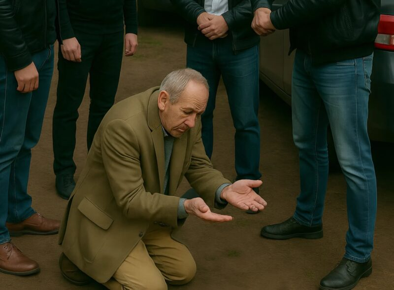 They pushed the old man to the ground. He fell to his knees, his hands shaking.