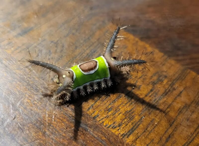 Later I learned that it was a saddleback caterpillar. And I can consider myself incredibly lucky: if I had picked it up with my hand, like I almost did at first, things could have ended very badly.