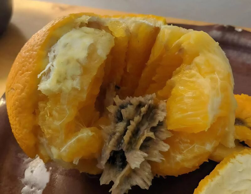 At first glance, it looked like a second, deformed orange had started developing inside the main one. But it looked alarming — the surface was a bit porous, had a grayish coating, and emitted a musty, rotten smell.