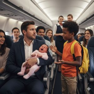 Little Nora’s cries echoed through the luxurious cabin of the flight from Boston to Zurich. First-class passengers shifted uncomfortably in their leather seats, exchanging annoyed glances and stifled sighs.