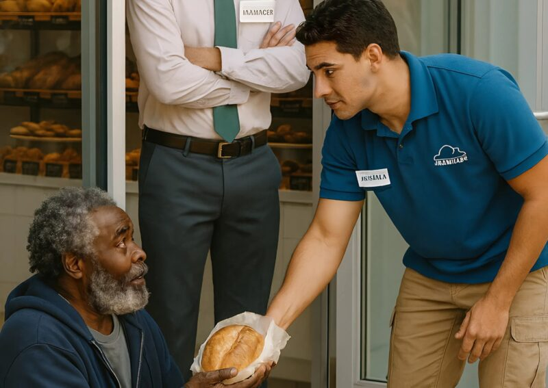 But I wasn’t going to give up. On my lunch break, I bought bread with my own money, went outside, and handed it to the homeless man. He looked at me as if I had given him the whole world. He thanked me, trembling, saying he hadn’t eaten since the day before.