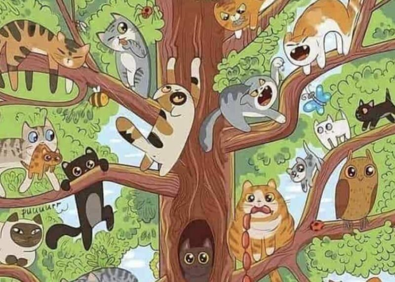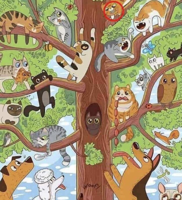 In the image provided, dogs and cats are playfully gathered around a tree. If you find this challenge tricky, don’t give up! The answer awaits you.