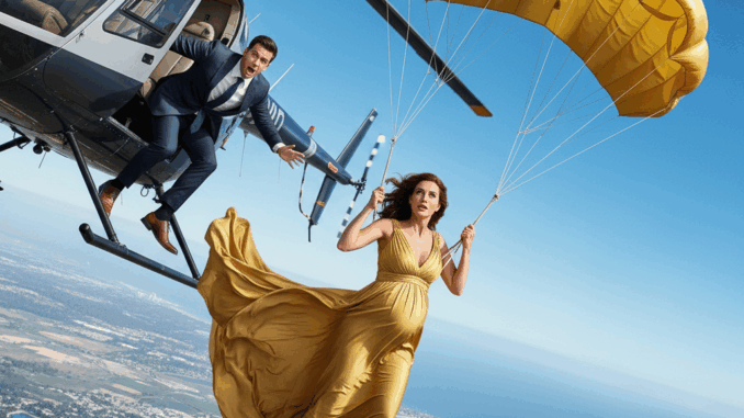 As the wind whistled around her, Amelia reached behind her and found the parachute hidden under her coat. She quickly adjusted her harness, praying she had enough time. The helicopter was already a distant speck above, and the world below seemed years away.