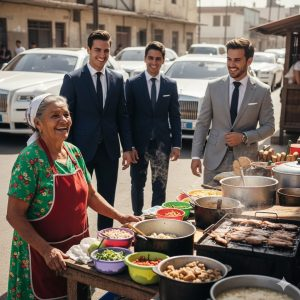 She blinked, thinking it was some kind of recording, a wedding, something involving people who didn’t belong there. But the cars died away, the doors opened calmly, and three people stepped out, dressed as if the whole city had been made just for them to walk on at that moment. Two men and a woman, upright posture, impeccable shoes, their gazes not lingering on shop windows or other displays. They first glanced at the metal cart laden with large bowls, roasted chicken, vegetables, rice, wrapped tortillas, and then at the rest of the food.