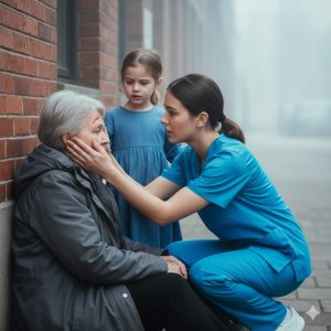 His mother, on the ground with blood on her forehead, had received the call from the driver 20 minutes earlier. Her mother had gotten out of the car, confused, walking aimlessly. She had frantically searched these streets until she finally saw her. But she wasn’t alone. A young woman in a blue nurse’s uniform was kneeling beside her, moving with the precision of someone trained for emergencies. A little girl, her daughter obviously, clung to her, whispering something in her ear.