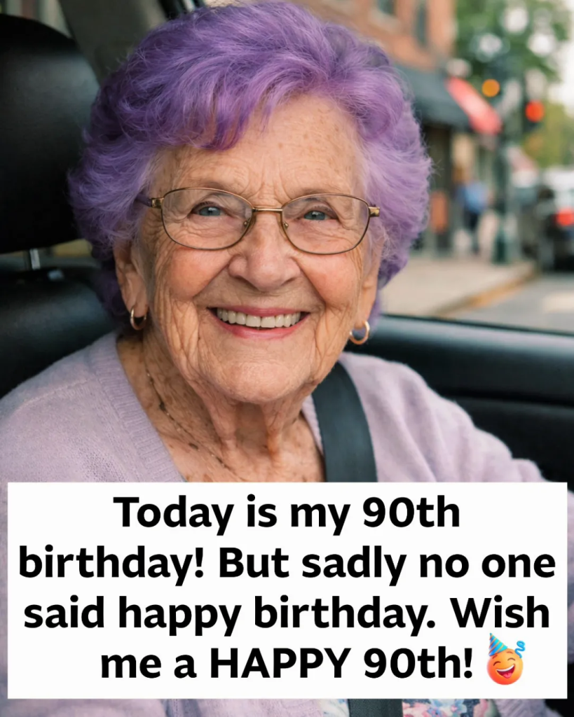 Today, as the sun shone brightly over the streets, 90-year-old Mabel sat in her car, looking out the window. She had her hair colored a vibrant shade of purple, a bold reminder that age does not define one’s spirit. It had been a quiet morning, with no one around to share in the joy of her milestone. Mabel had been waiting for the phone calls, the well-wishes, the celebrations that would usually fill her day with warmth. But as the hours ticked by, she realized something was missing: no one had said “Happy Birthday” to her yet.