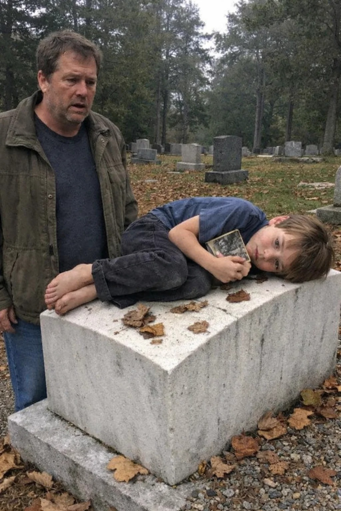 A boy lay asleep on his wife’s grave, barefoot, his dark hair tangled, his face drawn with exhaustion that no child should carry. His socks were worn thin, and his hands clutched something pressed firmly to his chest, as if it were the only thing anchoring him to the world.