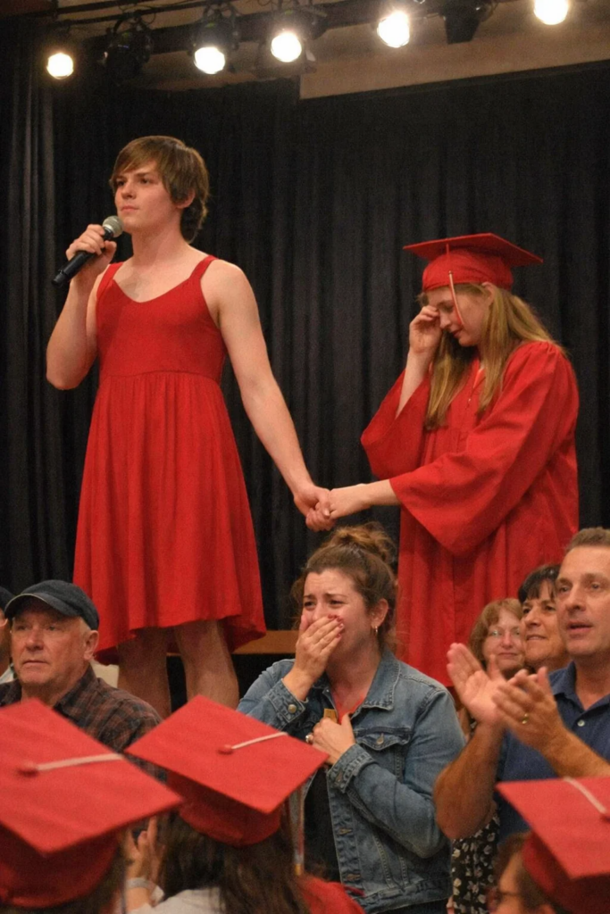 He walked through the doors wearing not the standard cap and gown, but a flowing red dress that caught the light with every step. It wasn’t sloppy or mocking. It was elegant, carefully chosen, the kind of dress that demanded to be seen. The room reacted instantly. Laughter rippled through the seats. Whispers spread like wildfire.