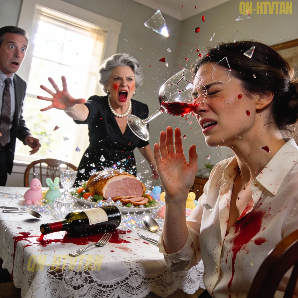 The wine glass didn’t just break—it exploded. One sharp, deafening crack that cut through the air and the conversation all at once. Red wine splattered across the white lace tablecloth, the polished silverware, the ham centerpiece that was supposed to symbolize togetherness. A heartbeat later, the sting hit.
