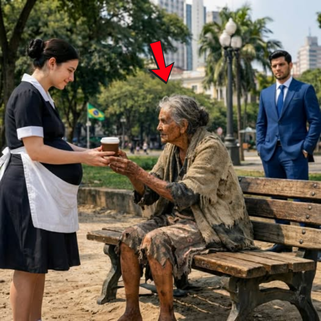 On the usual bench waited a hunched old woman, her clothes worn, her skin marked by cold and by life itself, her trembling hands resting on her lap. People passed by her as if she were part of the scenery—just another shadow of the city, a story that makes people uncomfortable and that they learn to ignore. But Julia did not ignore her. She stopped, carefully extended the coffee—as if offering it to someone important—and the old woman received it with a rough “thank you,” a broken voice that still sounded like shelter.