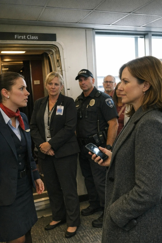 There are certain moments in life when humiliation does not arrive screaming, does not announce itself with violence or spectacle, but instead settles quietly on your shoulders like an unwanted coat, heavy with implication, delivered through polite language and procedural smiles that insist everything happening to you is reasonable, justified, and entirely your fault, and for Serena Whitaker, that moment unfolded on an ordinary Wednesday afternoon inside a First Class cabin that smelled faintly of citrus wipes, warm leather, and the unspoken belief that some people belonged there more naturally than others.