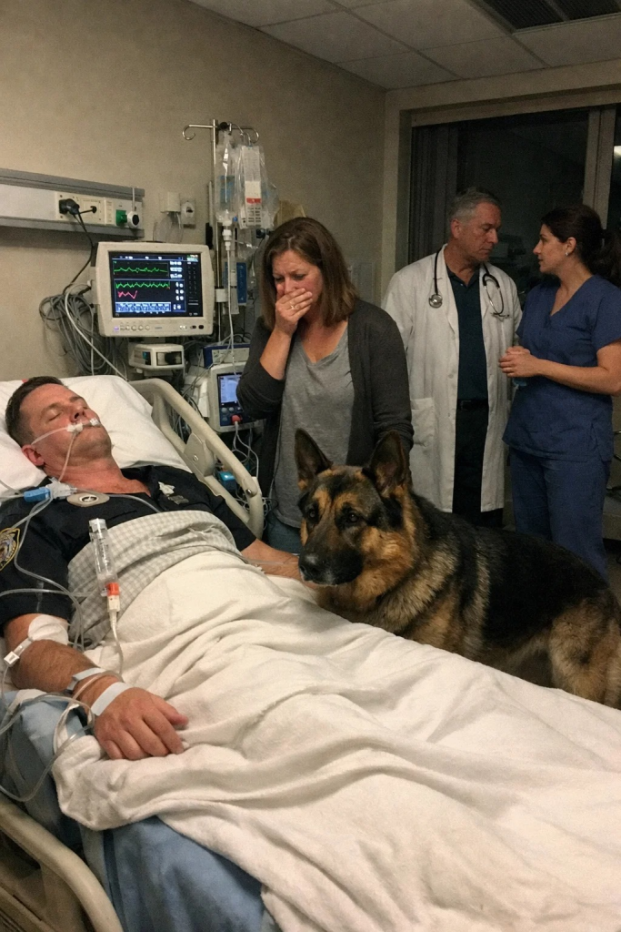 Doctors Said the Officer Was “No Longer There” and Asked His Wife to Let Go — Then His K-9 Stepped Between the Bed and the Machines, Reacted Seconds Before Every Alarm, and Exposed the Truth They Never Wanted Found.